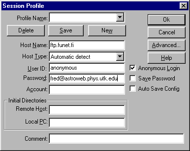 | Using WS_FTP The ftp protocol is used for transferring files between computers. You may use it to move files between various machines that you work on, or to download useful (or just fun) software to your machine from computers all over the world. All that is required is that both computers be connected to a common network (e.g., the Internet) and be running the ftp program. One program that can be used for running ftp on Windows computers is WS FTP (the noncommercial version of which is called WS_FTP LE). It is very easy to use. When you first start the program, you will see a "Session Profile" window, like that shown in the figure below, that prompts you for information needed to let you log onto the remote computer.