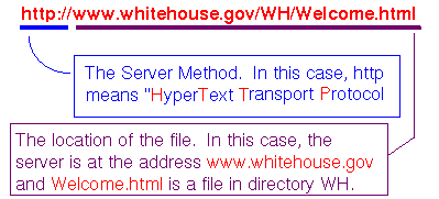 Para repasar, direcciones de URL que especifica de manera �nica un archivo en la Internet tienen dos partes b�sicas: (1) el m�todo de acceso del los archivos, y (2) otra que especifica el lugar del archivo en la Internet.