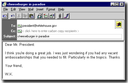 Eso es! Si tu computadora esta programada para recibir correo electr�nico y no has cometido ning�n error escribiendo la direcci�n, le acabas de enviar un mensaje electr�nico al Presidente y copia al Vice Presidente. Y tambi�n te enviaste una copia a ti, as� que lo debes de estar recibiendo pronto y, esperemos a ver si recibimos contestaci�n del Presidente y Vice Presidente.