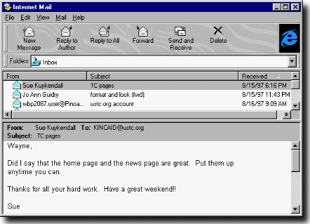 Los men�s desplegables para el correo de inteface de Explorer trabajan muchas de las funciones de los botones de control que ya hemos discutido y permite que el programa de correo sea hecho a la medida de tus aplicaciones. No entraremos en esos detalles ahora. Con la experiencia que has adquirido hasta ahora, debes estar capacitado(a) para figurar las funciones por ti misma(o). Si algunos de los mandatos te parecen confusos, ve al men� desplegable de "Help" para mas informaci�n.