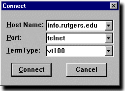 | Cuando tu lanzas Microsoft Telnet, una ventana del terminal se abre. Ah� es donde tu podr�s, una vez conectada, de escribir mandatos directamente a una computadora remota. Mueve tu rat�n hacia la parte superior de la ventana para mostrar el men� desplegable de "Connect"; debe ser similar a la figura a la derecha. Arrastra hacia abajo para sombrear "Remote System", y su�ltalo. El resultado en el monitor de la aparici�n instant�nea del registro de "Connect" se parece a la siguiente figura. |