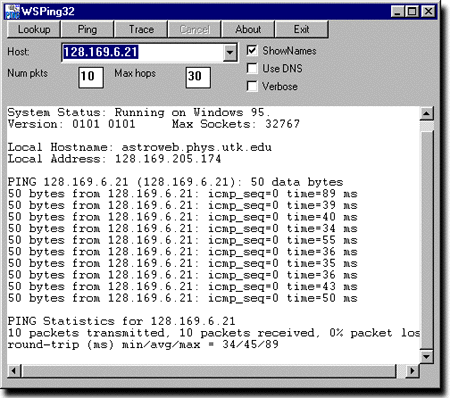 El programa que has bajado y abierto se llama Wsping32. Te puede servir de herramienta cuando tengas problemas. Si tienes una larga espera en conectarte a una computadora remota, puedes usar este programa para verificar si esa computadora est� actualmente viva en la Internet. Simplemente entras el n�mero de IP o el nombre de DNS de una