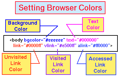 Las etiquetas en el diagrama se explican por si solas en base a la previa discusi�n excepto, quiz�s, el color "accessed link". Este es el color que da el enlace mientras el bot�n del rat�n se mantiene oprimido. As�, por ejemplo, la frase text="ff0000" prepara el color del texto standard a rojo. Ahora, es obvio que debe estar usando alg�n tipo de c�digo secreto: como se que #ff00000 significa prepara el color del texto del navegador a rojo?