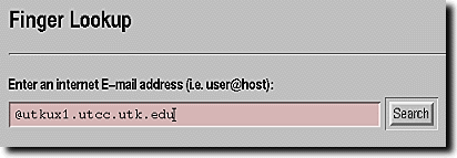 Vamos a suponer que deseamos ver qui�n est� actualmente utilizando la computadora con la direcci�n de IP utkuxl.utcc.utk.edu. Entrando al previo pasillo de Finger te da una ventana de di�logo en donde entramos la direcci�n de IP precedida por el s�mbolo (@):