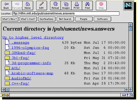 En tu segunda ventana del navegador de la Web, entra la siguiente direcci�n de URL: ftp://rtfm.mit.edu/pub/usenet/news.answers