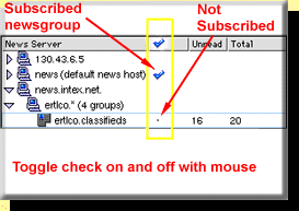 Para suscribirte al grupo de noticias, Oprime la entrada para el grupo de noticias en la columna marcada con una marca en la parte superior (ver figura adyacente). Este grupo de noticias est� suscrito si esta si aparece un punto en la fila. Puedes retroceder y/o adelantar entre estas opciones usando el rat�n.