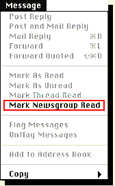 El lector de noticias tiene muchas maneras sofisticadas de guardar mensajes, de pasarlos adelante a otra persona, a agruparlos ("thread") y as� sucesivamente. Te dejaremos explorar las posibilidades por ti misma(o) (acude a los archivos de ayuda de tu navegador). De todas maneras, antes de terminar esta secci�n te se�alaremos un punto muy importante: el mandato de "Mark Newsgroup Read" que es accesible por el men� de "Message"(ver figura adyacente).Esto marca todos los mensajes en el grupo de noticias seleccionando "leer" ("read"); de esta manera solo pondr�n los mensajes nuevos la pr�xima vez que veas este grupo de noticias (si has seleccionado "Show Only Unread Messages" bajo el men� de "Options" --- ver la primera figura en �sta secci�n).