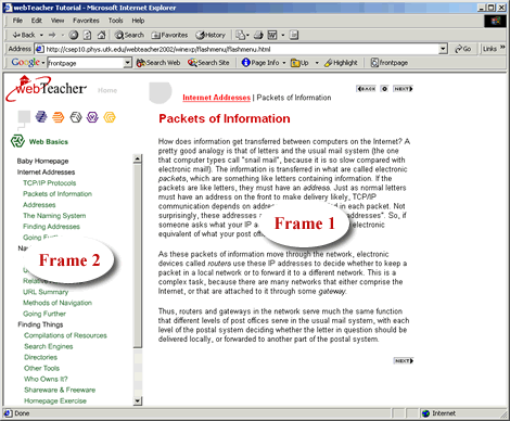 Yes, webTeacher uses frames. In the figure below "Frame 1" labels the main display area of webTeacher; "Frame 2" labels a clickable table of contents. When one of the entries in Frame 2 is clicked, the corresponding page loads into Frame 1.