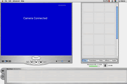 Now click the Import button under the blue monitor screen. The camera should start up and begin dropping clips into the shelf. Downloading can stop at anytime by clicking the Play button or turning the camera off. You will notice that the each clip is numbered at the bottom and the length of time of each clip appears at the top.