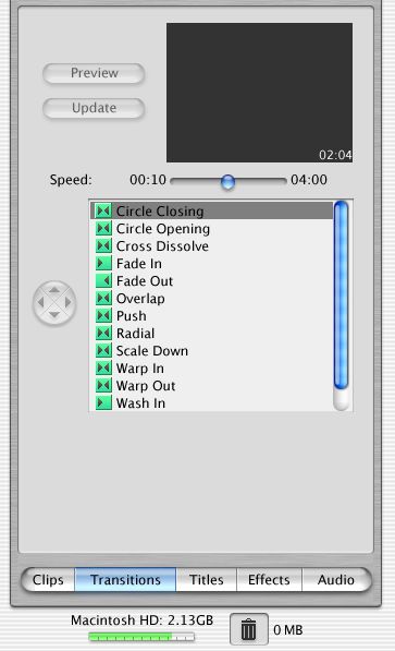 A transition can be edited easily. The duration can be changed and a new transition can replace the one already rendered or the transition can be deleted. Click once to select the transition icon in the Movie track. The duration of the transition can be increased or decreased by moving the Speed slider and then clicking the Update button.