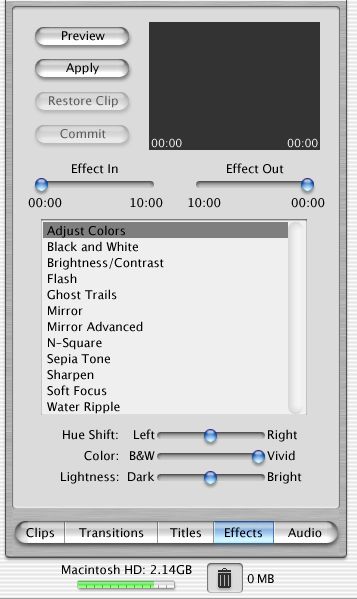 These visual effects can be added to one clip or multiple clips. For multiple clips, hold the shift key down while clicking the other clips wanted. If an effect is wanted only on part of a clip, that part of the clip will first need to be highlighted in the Scrubber bar area. When the effect is applied, the area to the left and right of the highlighted area will be made into two separate clips and the effect will be applied only to the highlighted area. Unless you fine tune it, an effect starts at the beginning and stops at the end of the clip. The Effect In and the Effect Out sliders are controls that can be used to fine tune when the effect starts and ends in the clip. Colors can also be adjusted by using the three sliders under the list of effects. |