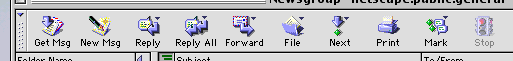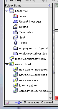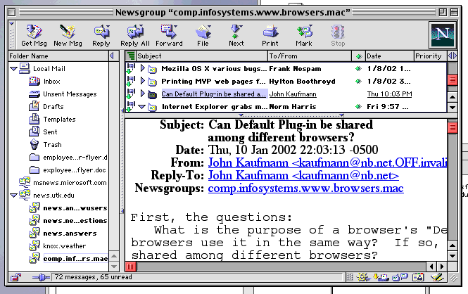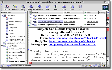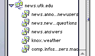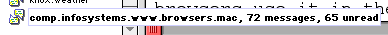 In the example shown in the first figure above, the newsgroup comp.infosystems.www.browsers.mac has been selected, as indicated by the box surrounding this entry in the Folder Name panel. Note that the group's name now appears in the title bar of the newsreader.