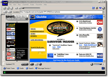 on your computer. RealPlayer's Realguide A starting point for exploring audio/video sites on the Internet is the realguide. From this site, you can find a variety of News, Industry, Business, and on-line radio broadcasts of all types, as well as special events. The site can be accessed from the link just given, and it can also be accessed directly from RealPlayer itself, as shown in the figure below. Assuming that RealPlayer has been installed and configured to launch automatically from your browser, you can explore a variety of sites simply by clicking and following the instructions. Check out this gallery to search for audio and video of special events from NASA's space missions.