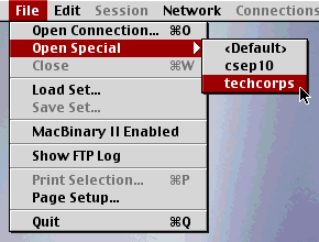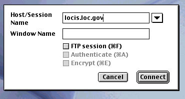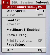 Open NCSA Telnet by double-clicking on its icon. From the resulting menu, choose "Open Connection" from under "File", as illustrated in the adjacent image. The resulting popup login screen looks like the figure below.