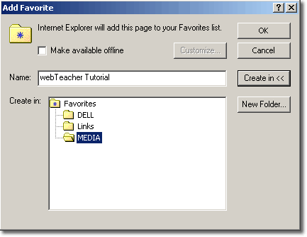 Add To Favorites adds the URL of the presently displayed document to the favorites list. A window like that shown below opens to allow you either to choose the name of an existing folder in which to place the URL or gives you the chance to create a new folder for the URL.