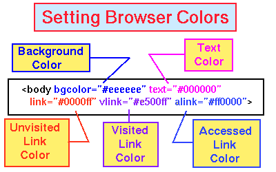 In this tag, bgcolor sets the color of the page background, text sets the default color for text on the page (it can be overriden for portions of text), link sets the color of unvisited links (ones you haven't clicked on yet), vlink sets the color of visited links, and alink sets the color that the link turns while the mouse button is being held down.