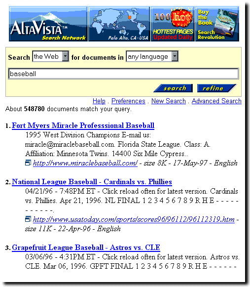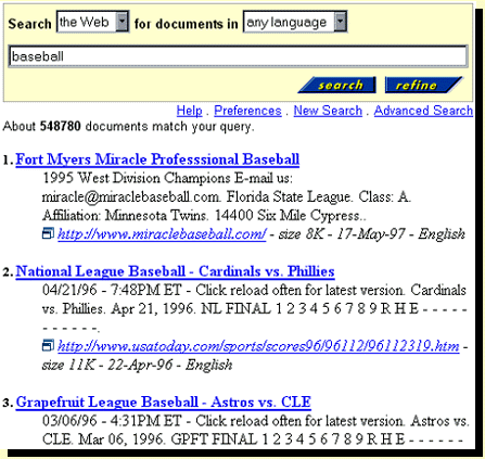 the engine found the word(s). For a search on "baseball", the top of the page