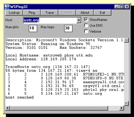 The program you have downloaded and unzipped is named WSPing32; it can be used to check connections on the Internet. You simply enter the IP number or DNS name of a remote computer in the box labeled "Host" and click one of the buttons at the top of the WSPing32 window. The program's buttons perform the following functions: