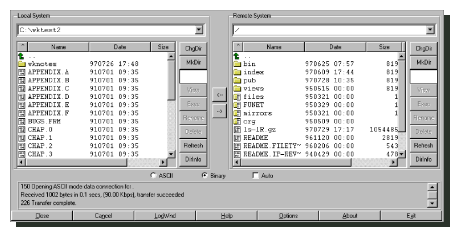 Thus, we select the button below the two file lists called "Binary". (In many cases, the button labeled "Auto" will cause the WS_FTP LE program to make the correct selection of "ASCII" or "Binary" automatically, but if you know the format for certain it is better to specify it.) Now you need to specify where on your computer you want to put the file you are about to download. In the list of files and directories on the left, locate and click on the folder that you want to use for the destination. If you do not see this folder in the list, double click the up arrow at the top of the list to go to the next higher level directory. (Continue until you find the folder you want and then click once on it to select.) Now we are ready to download. Since you want to transfer the file from the server in Finland (the list of files on the right) to your computer (the list of files on the left), just click the arrow in the middle of the display, between the two lists, that points from the right list to the left list.