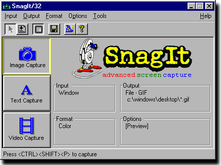 Open SnagIt by going to the folder that contains the program and double-clicking its icon. The resulting display should look like the figure below. This window is divided into three basic sections.