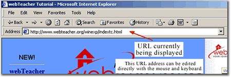 So now we know WHAT to navigate to (URL addresses). What are the methods that we can use to navigate with a Web Browser? There are several ways, some of which you have already used: (1) You can click on links and buttons, as you have already done in several examples. If you have difficulty, visit the Web Browser Primer to review how browsers work. (2) You can enter the URL address directly into the browser. In Explorer, you can enter it into the "Address" window on the browser:
