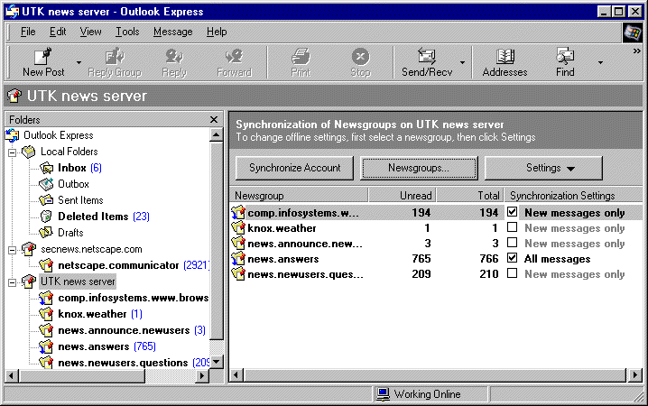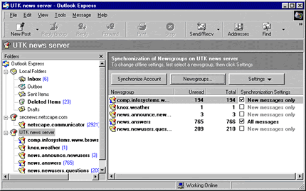 Note: the Folders panel in the newsreader window of Outlook Express may also have links to various email folders if you've configured this program for accessing email. If you've configured more than one news server, there will be links to all of them in the Folders panel. (One of the configured news server is specified as the default. This is the one you automatically connect to when the newsreader first opens.)