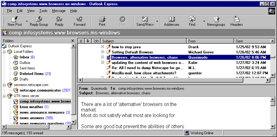 The newsgroup comp.infosystems.www.browsers.ms-windows has been selected in the Folders panel by clicking with the mouse button, as indicated by the newsgroup name being highlighted. From the list of posted messages for this newsgroup a posting entitled "Browsers, alternative browsers, chaos", posted by a user (nicknamed) Quasimodo on January 26, 2002, at 8:06 PM has been selected, and the text of that message appears in the bottom panel.