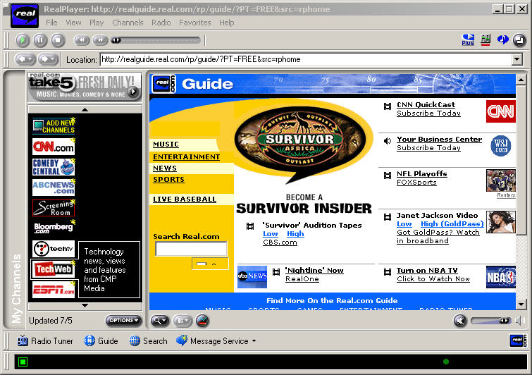on your computer. RealPlayer's Realguide A starting point for exploring audio/video sites on the Internet is the realguide. From this site, you can find a variety of News, Industry, Business, and on-line radio broadcasts of all types, as well as special events. The site can be accessed from the link just given, and it can also be accessed directly from RealPlayer itself, as shown in the figure below. Assuming that RealPlayer has been installed and configured to launch automatically from your browser, you can explore a variety of sites simply by clicking and following the instructions. Check out this gallery to search for audio and video of special events from NASA's space missions.