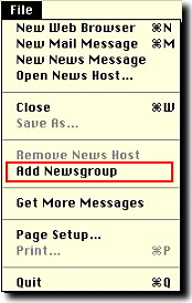 A newsgroup is added to the display list by selecting "Add Newsgroup" from