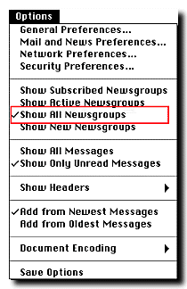 selecting "Show All Newsgroups" under the "Options" menu (see figure at right). This causes the