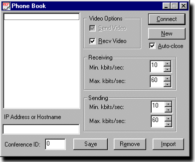 To add an entry to this list, we go to the Phone Book window and first click the "New" button. This brings up a window in which we can enter some text to name this entry. The name will appear in the listing at the left side of the Phone Book window; you don't have to enter any sort of "official" name here, just something that will later remind you what the site is. After you've entered this text, click "OK" and the text will be added to the list at the left side of the Phone Book window. Next we enter the IP address or hostname of the site that we want to store, and information about sending/receiving rates, etc. just as we did before. Finally, instead of selecting "Connect" to immediately go to the site, we select "Save". This appends the information we just entered to a disk file named PhoneBook.pbx that CU-SeeMe maintains in the same folder as the CU-SeeMe executable program. (This is just a simple text file and you can look at it with any text editor if you're curious about its format.) In the future, if you want to return to this same site, all you have to do is open the Phone Book window and double-click on the entry for this site in the list of site "names". CU-SeeMe will retrieve the information it needs from the PhoneBook.pbx file and make the connection. If you single click, the item will be selected (but you won't connect yet) and the information on the right side of the window will change to reflect the values previously saved for the selected site. You can take your phone book list to another PC if you wish, by copying the PhoneBook.pbx file to the new machine (be sure to place it in the same folder there as the CU-SeeMe executable program). If you have additional phone book lists in other directories (for instance, you may have gotten some from colleagues), you can combine their entries with those in your list by clicking the "Import" button in the "Phone Book" window. When you do this, you will be prompted for whether or not you "want to use your rates when importing". If you click no, imported entries will maintain the same send/receive rates that they have in the original list (that you are importing from). If you click yes, the original rates will be ignored and the entries will be added to your phone book file with all now having the rates that you specified with the "Rates" tab in "Preferences".